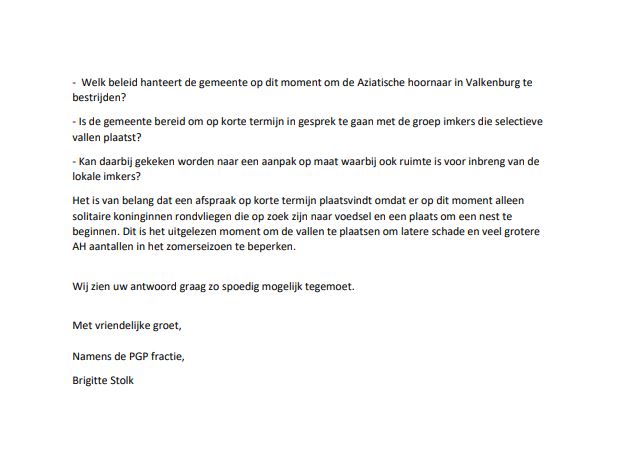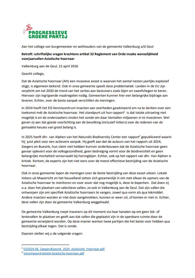 Vanuit verschillende hoeken kregen wij berichten van bezorgde burgers in Valkenburg aan de Geul. Een werkgroep houdt zich bezig met het het vangen van koninginnen van Aziatische Hoornaars en de gemeente verwijdert deze vallen. Hierover hebben wij vragen gesteld in een zogenaamde Artikel 32 brief. Deze wordt beantwoordt door het college van Burgemeester & Wethouders binnen 15 werkdagen.